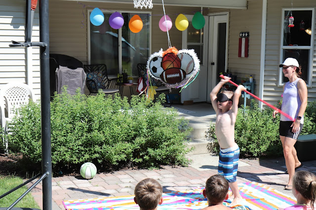 The next day Mason got to have a birthday party with lots of friends. They did a water party in the backyard with a pool, water guns, water balloons, and a sprinkler